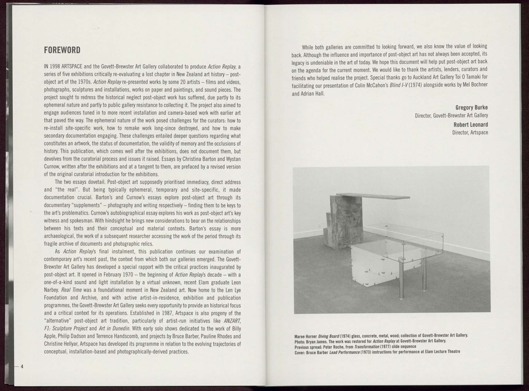 Published following the exhibition series Action Replay: Post-Object Art at Artspace, 1998; Govett-Brewster Art Gallery, 1998; Auckland Art Gallery Toi O Tāmaki 1998-1999.