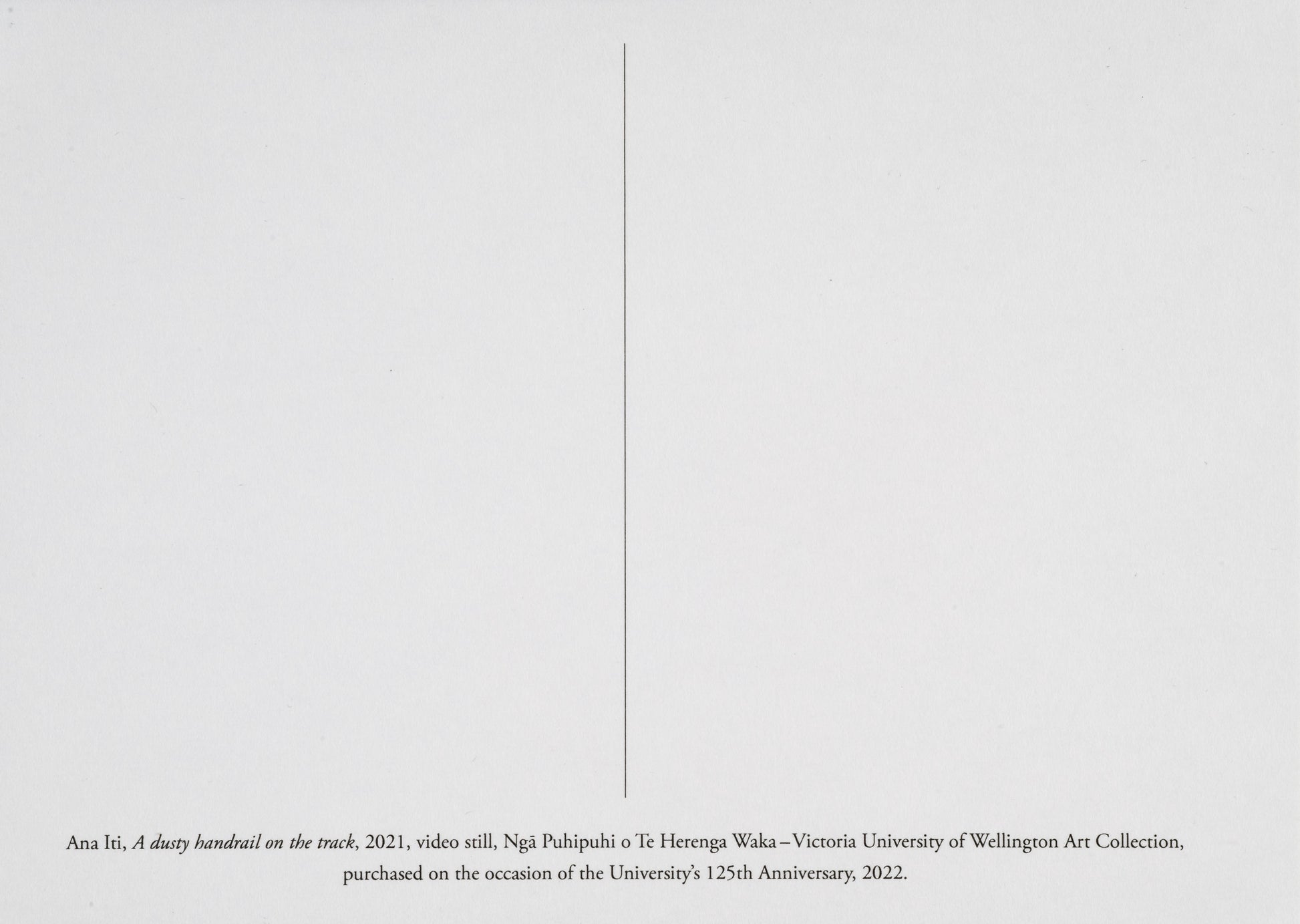A postcard featuring a still from Ana Iti's video work, A dusty handrail on the track, 2021, Ngā Puhipuhi o Te Herenga Waka – Victoria University of Wellington Art Collection,