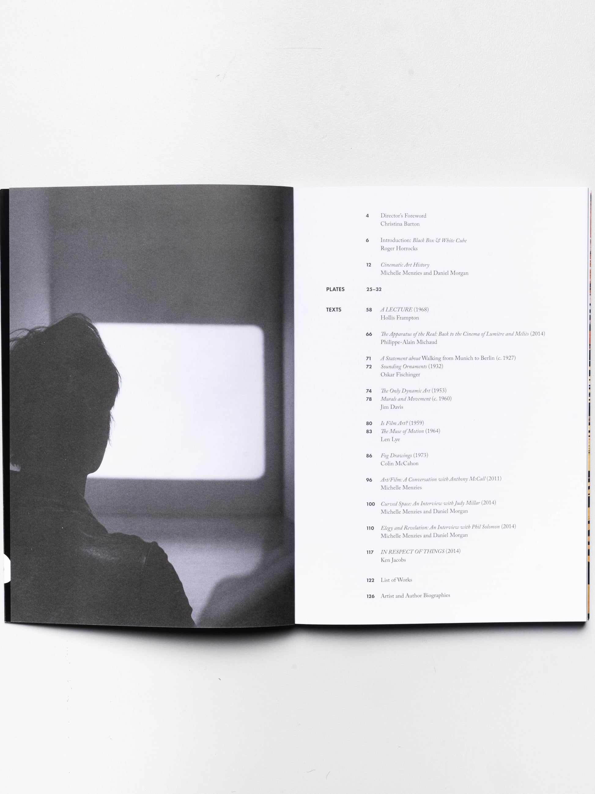 This book was published in association with the 2014 exhibition, Cinema & Painting, Adam Art Gallery’s contribution to the 2014 New Zealand International Festival. This ambitious exhibition represented a continuation of two directions in the Gallery’s programme: of investigations into the history of film and photography in exhibitions such as Anthony McCall: Drawing with Light (2010) and Dark Sky (2011); and of shows emerging from scholarship, such as Billy Apple: New York, 1969-1973 (2009) and Peripheral Relations: Marcel Duchamp and New Zealand Art 1960-2011 (2012). A major exhibition that offered a rethinking of the relation between film and painting, Cinema & Painting highlighted connections between an international group of pioneering filmmakers and historically significant artists, as well as a newer generation of artists. The exhibition drew on curator Michelle Menzies’ doctoral research on media aesthetics, and was developed with Daniel Morgan of the University of Chicago, whose work focuses on film and aesthetics.
