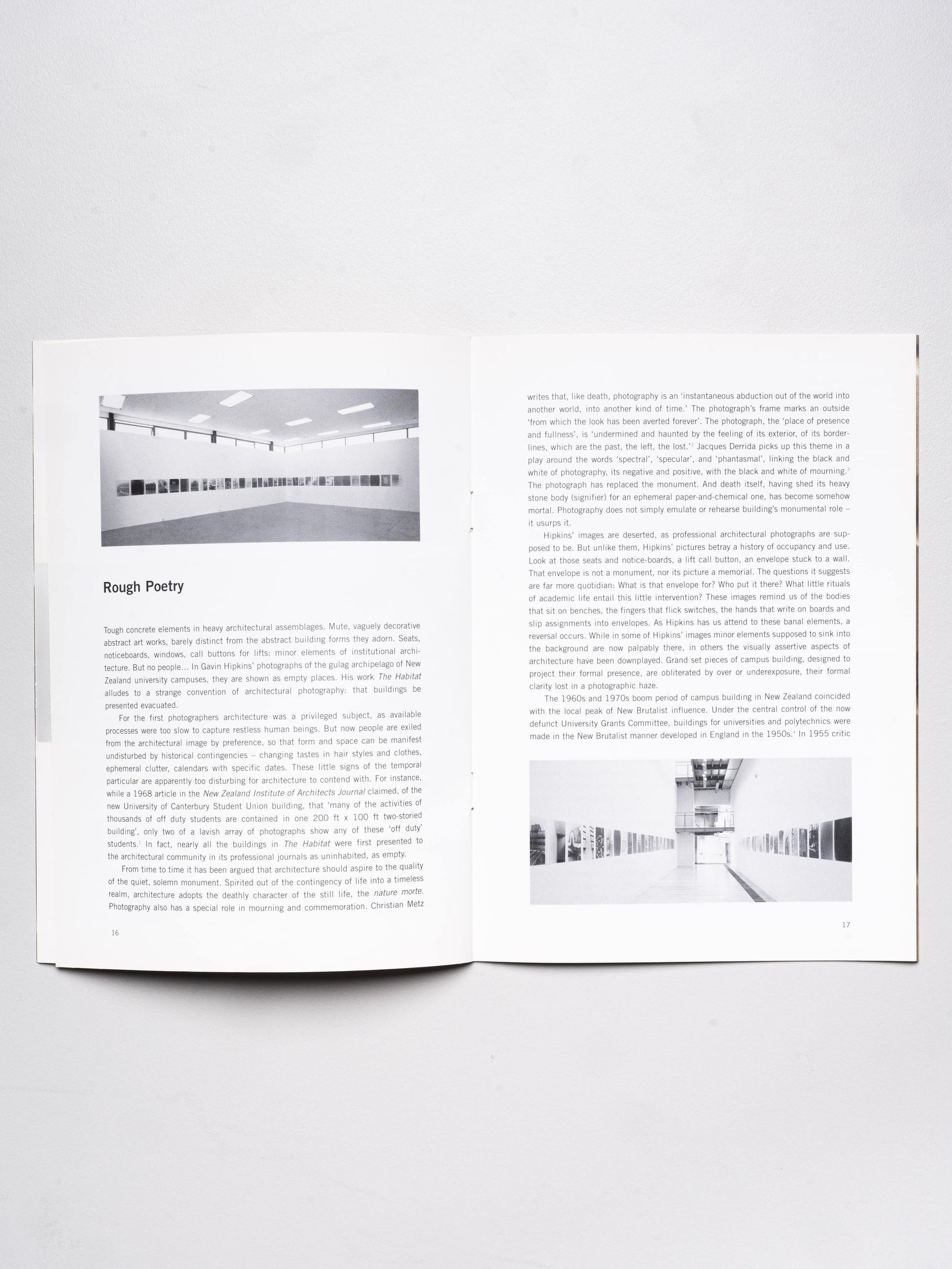'Hipkins' images are deserted, as professional architectural photographs are supposed to be. But unlike them, Hipkins' pictures betray a history of occupancy and use. While in somes of Hipkins' images minor elements supposed to sink into the background are now palpably there, in others the visually assertive aspects of architecture have been downplayed. Grand set pieces of campus building, designed to project their formal presence, are obliterated by over or underexposure, their formal clarity lost in a photographic haze.