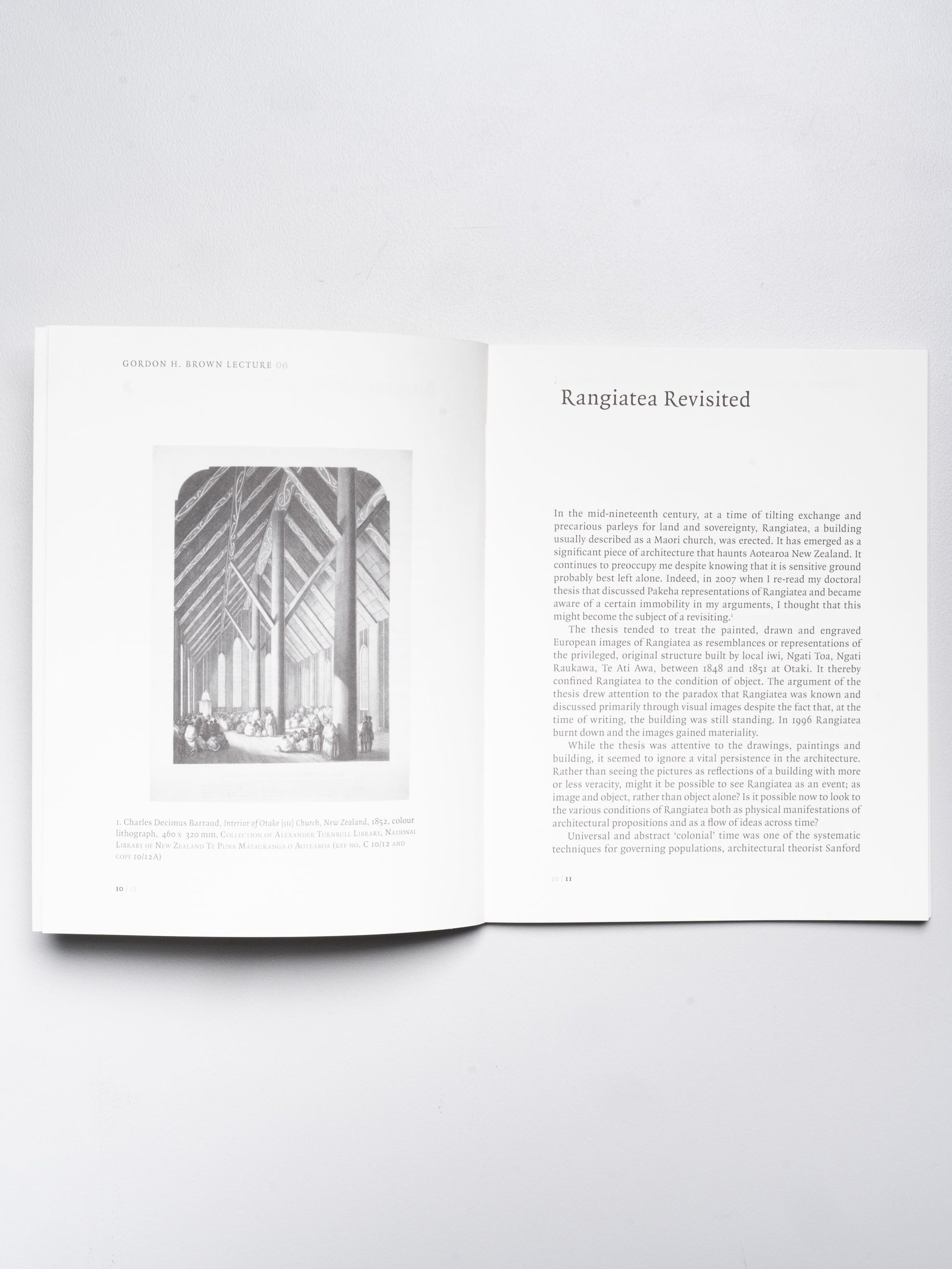 Her argument models a new way of thinking about architectural heritage, in which the physical preservation of an actual building matters no more than its survival and reinvention across the entire field of representation, to convey a refreshing new vision of architecture as multiple, sequential and renewable. For Treadwell, Rangiatea exists in built form, but also in prints, drawings, photographs, and written accounts, as a space where the principles of western architecture are both invoked and undone. In this her text serves as an exemplary postcolonial re-reading that aptly fits the format of the annual Gordon H. Brown Lecture.