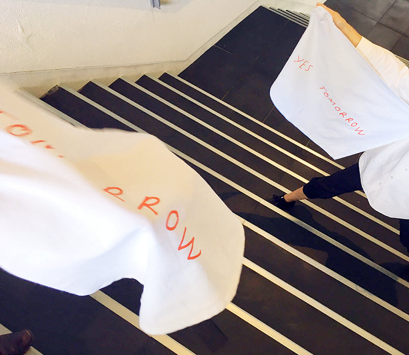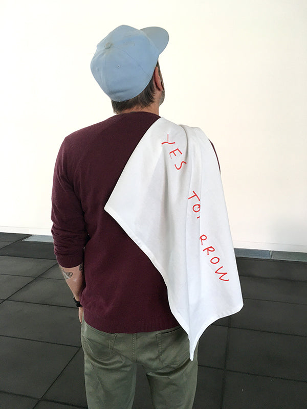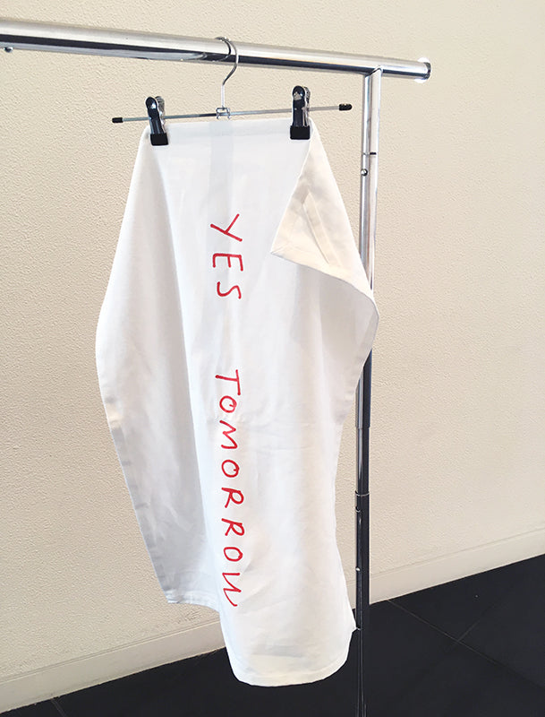 To accompany Kate Newby’s 2021 exhibition YES TOMORROW, Adam Art Gallery produced an editioned tea towel featuring the hand-written phrase the artist has used to title her show. Screen-printed on fine white cotton. Proceeds from sales went towards producing a publication associated with the exhibition.