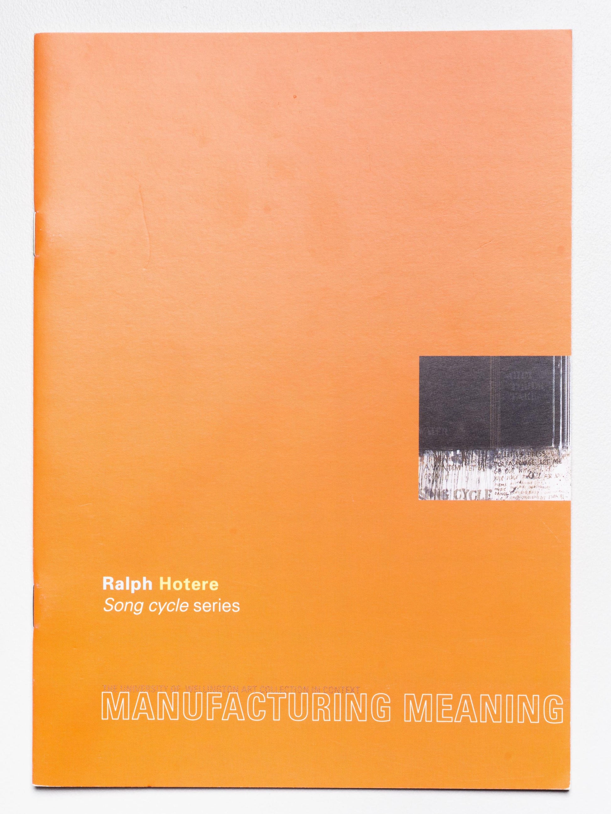'This catalogue is one of ten published on the occasion of the exhibition, Manufacturing Meaning: the Victoria University of Wellington Art Collection in context. It documents a multi-media installation including works from Ralph Hotere's Song cycle series, 1975, one of which is in the Victoria University Art Collection, seen in conjunction with a sound/light piece by Jack Body, with assistance from David Crossan. And, in his essay, Lawrence McDonald explores the history of these works in relation to the performance event of the same title which was staged at Victoria University in 1975, which saw Ralph Hotere working with composer Jack Body ; pianist, Barry Morgan; poet, Bill Manhire and choreographer, John Casserly.'